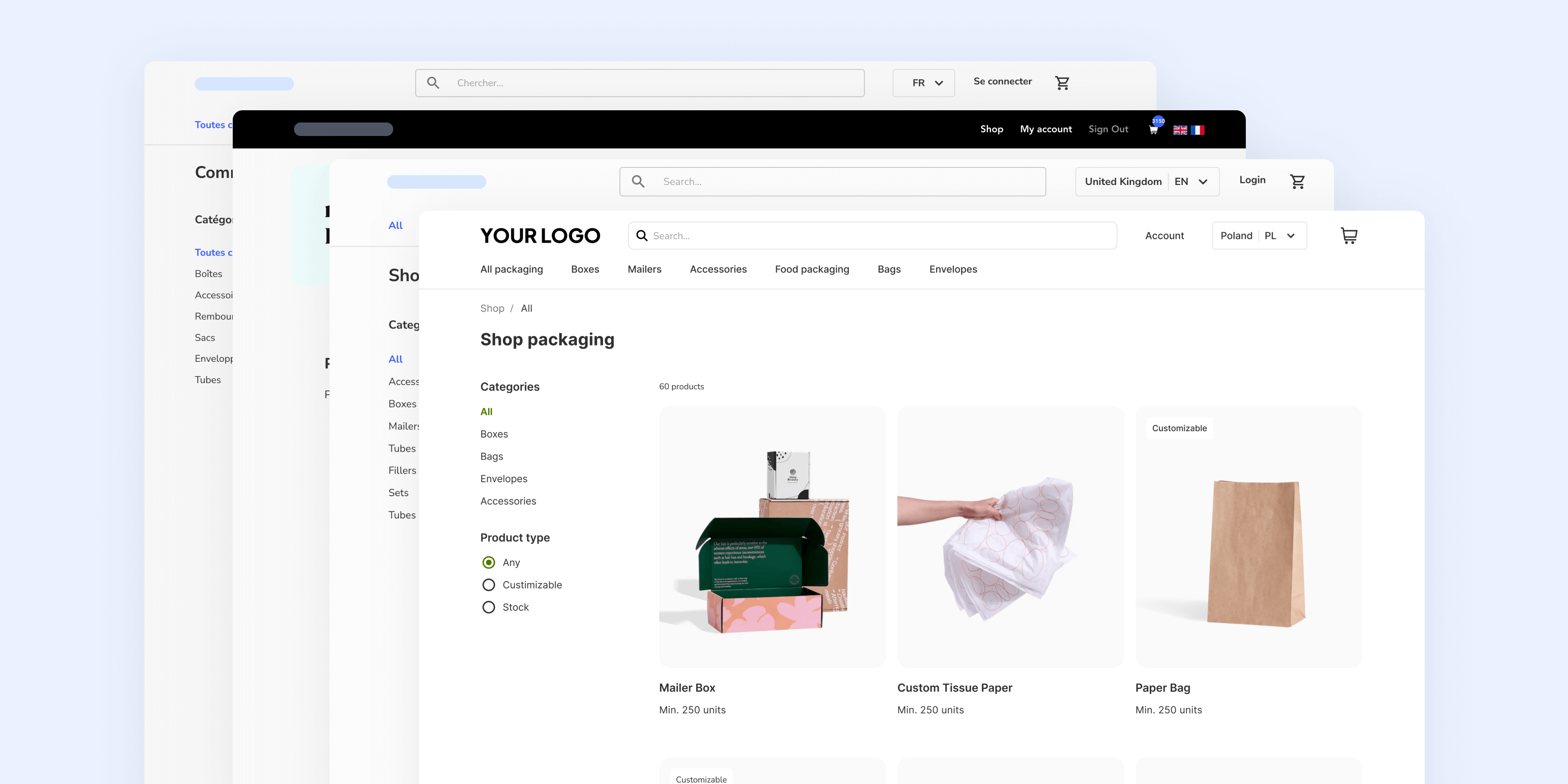 Offer a range personalised and stock packaging, carefully composed using a network of 200+ EU-based suppliers. All products are available for purchase to you and your sellers in your custom, integrated store.